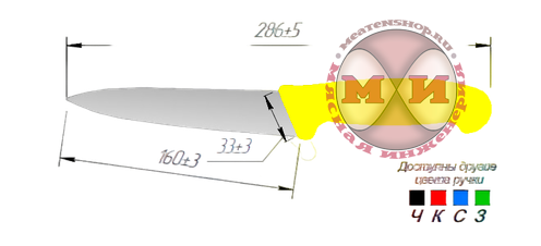 Длина лезвия - 16 см. Возможные цвета ручки: черный, красный, синий, зелёный, жёлтый.