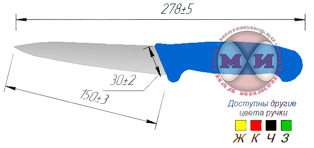 Длина лезвия - 15 см. Возможные цвета ручки: черный, красный, синий, зелёный, жёлтый.