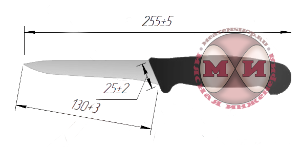 Ширина клинка: 25±2 мм; Макс.толщина обуха клинка: 2,8(-0,2) мм; Твердость клинка: 52..54 HRC; Материал клинка: высоколегированная нержавеющая сталь марки 50Х14МФ; Материал рукояти: полипропилен+термоэластопласт; Тип рукояти: цельная.