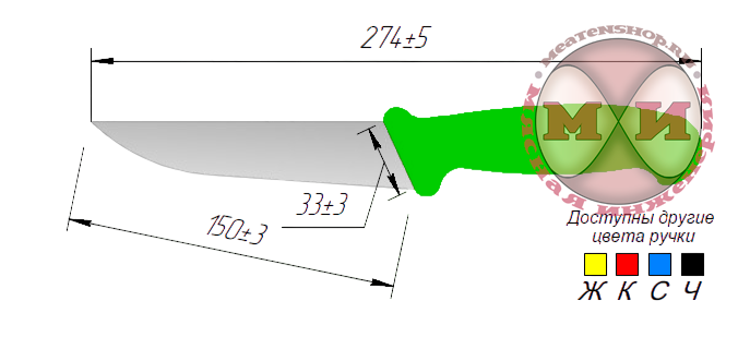 Длина лезвия - 15 см. Рукоять с двойным упором. Возможные цвета ручки: черный, красный, синий, зелёный, жёлтый.
