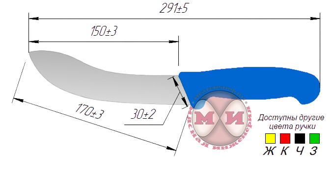 Длина лезвия - 15 см. Возможные цвета ручки: черный, красный, синий, зелёный, жёлтый.