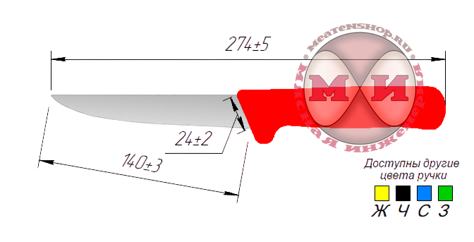 Длина лезвия - 14 см. Прямая рукоять. Возможные цвета ручки: черный, красный, синий, зелёный, жёлтый.