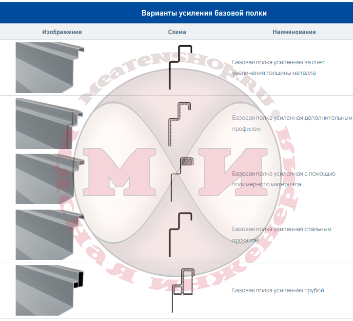 ВАРИАНТЫ УСИЛЕНИЯ БАЗОВОЙ ПОЛКИ: - Базовая полка усиленная за счет увеличения толщины металла; - Базовая полка усиленная дополнительным профилем; - Базовая полка усиленная с помощью полимерного материала; - Базовая полка усиленная стальным прокатом; - Базовая полка усиленная трубой.