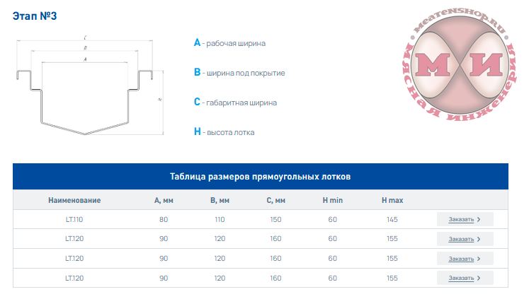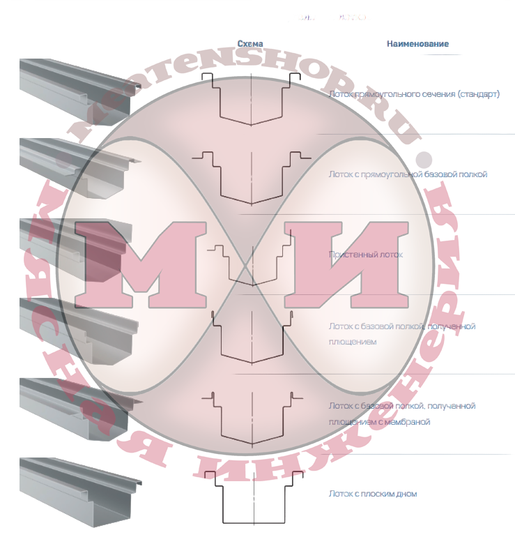 ПРОФИЛИ ПРЯМОУГОЛЬНЫХ ЛОТКОВ: - Лоток прямоугольного сечения (стандарт) ; - Лоток с прямоугольной базовой полкой; - Пристенный лоток; - Лоток с базовой полкой, полученной плющением; - Лоток с базовой полкой, полученной плющением с мембраной; - Лоток с плоским дном.