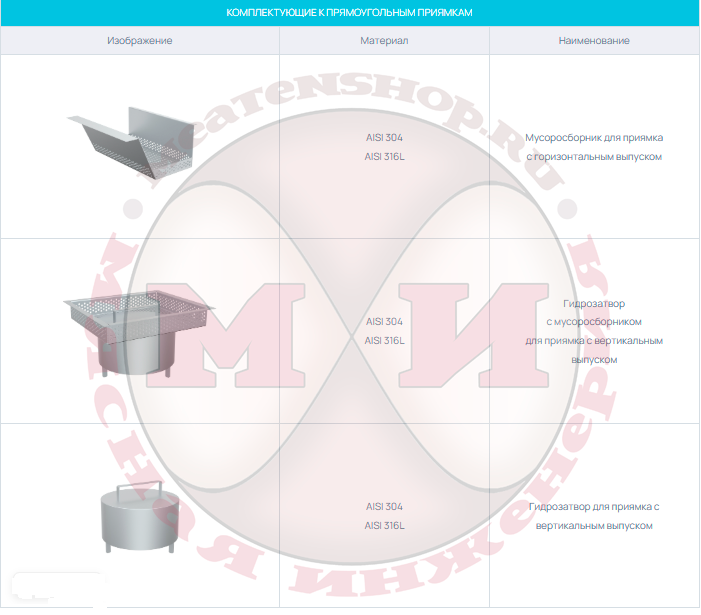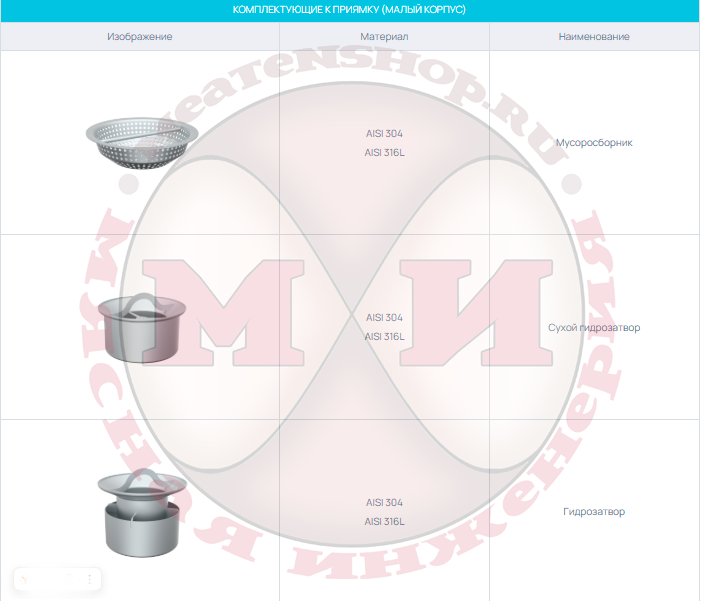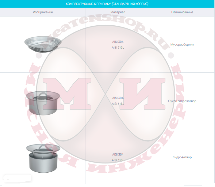 Материал Наименование AISI 304, AISI 316L Мусоросборник AISI 304, AISI 316L Сухой гидрозатвор AISI 304, AISI 316L Гидрозатвор