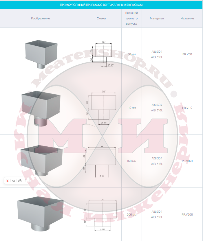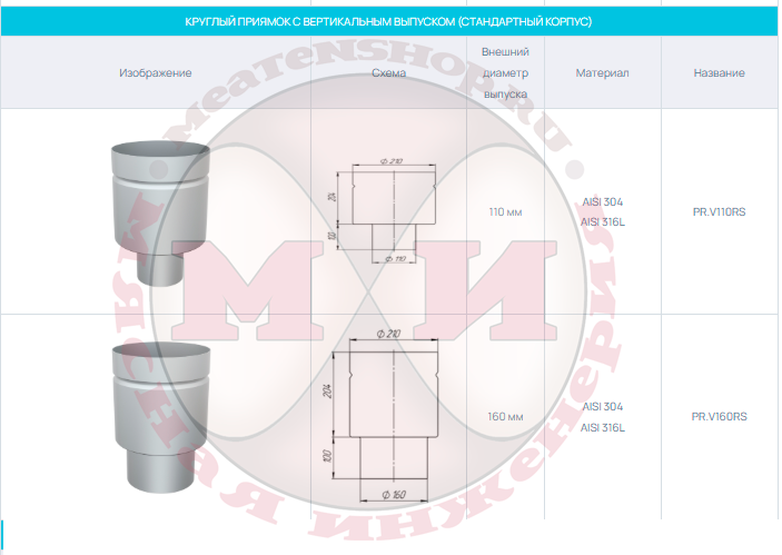 Внешний диаметр выпуска Материал Название 110 мм AISI 304, AISI 316L PR.V110RS 160 мм AISI 304, AISI 316L PR.V160RS