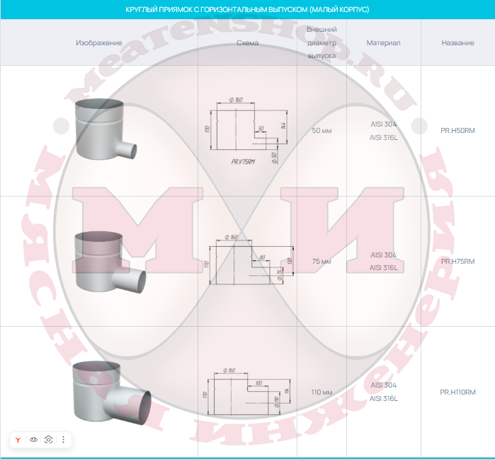 Внешний диаметр выпуска Материал Название 50 мм AISI 304,AISI 316L PR.H50RM 75 мм AISI 304, AISI 316L PR.H75RM 110 мм AISI 304, AISI 316L PR.H110RM