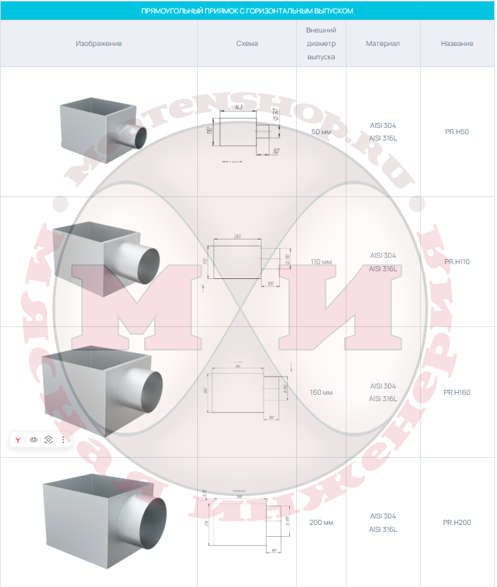 Внешний диаметр выпуска Материал Название 50 мм AISI 304, AISI 316L PR.H50 110 мм AISI 304, AISI 316L PR.H110 160 мм AISI 304, AISI 316L PR.H160 200 мм AISI 304, AISI 316L PR.H200