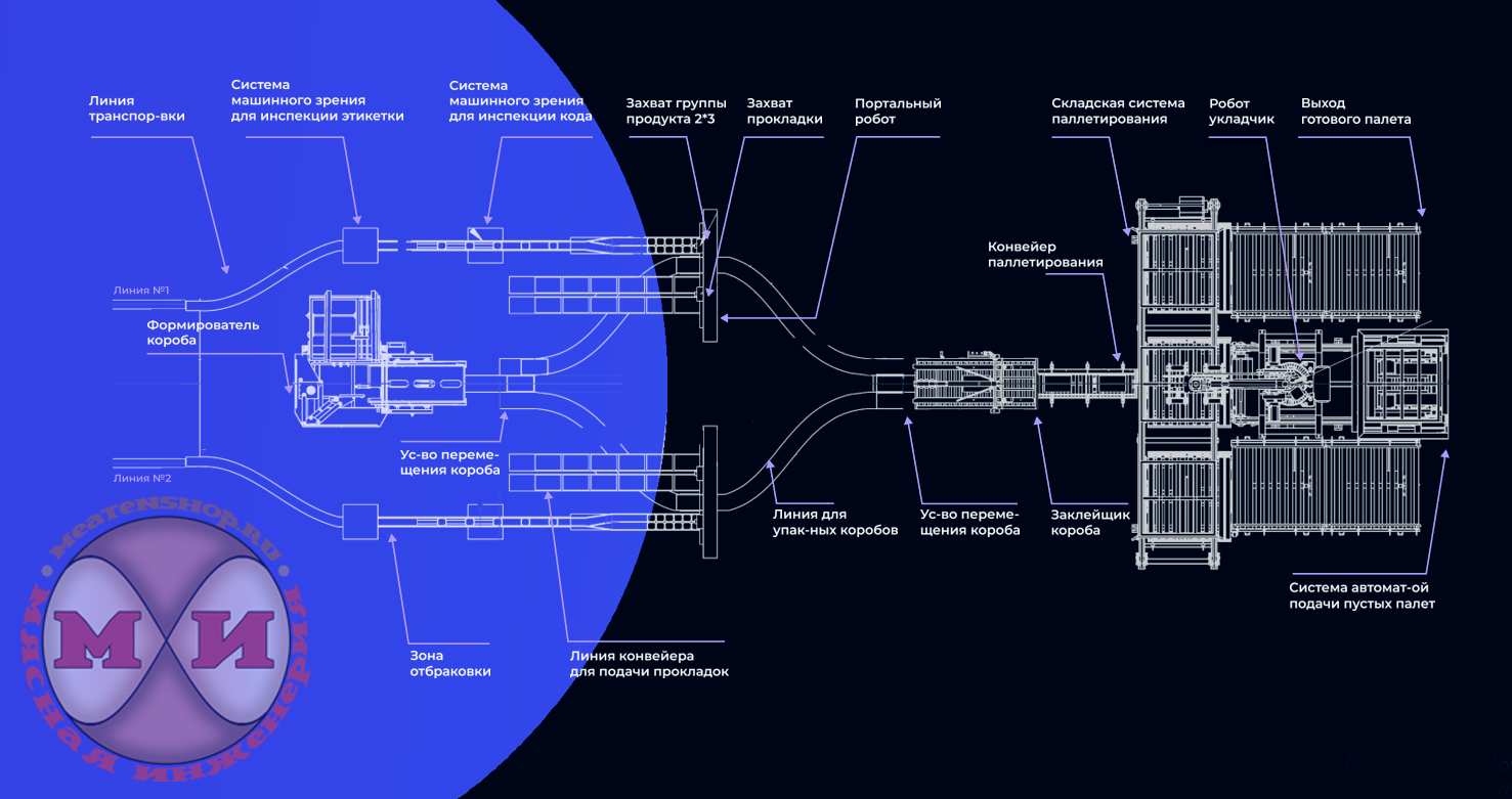 Состав автоматической линии на фото: - Формирователь коробов — 1 шт; - Конвейер для перемещения продукта — 2 шт; - Система машинного зрения, визуального контроля — 4 шт; - Конвейер для перемещения продукта — 2 шт; - Устройство для перемещения картонной коробки — 2 шт; - Конвейер для перемещения проложек — 4 шт; - Устройство перемещения коробок — 2 шт; - Система отбраковки — 2 шт; - Портальный робот — 2 шт; - Конвейер №1 для картонных коробок — 2 шт; - Конвейер №2 для картонных коробок — 2 шт; - Заклейщик коробов — 1 шт; - Робот паллетайзер — 1 шт; - Складская система паллетирования — 1 шт; - Конвейер для паллет — 1 шт; - Система управления — 1 шт.