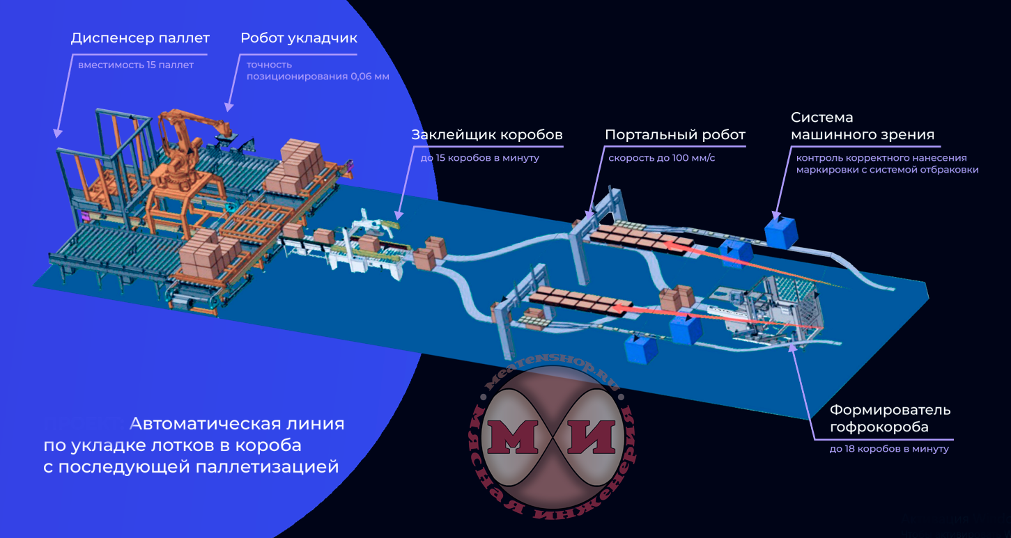 Производительность 80-90 уп/мин., размер короба 385х230х300 мм, размер лотка 127х114х31 мм. Состав автоматической линии: - Формирователь коробов — 1 шт; - Конвейер для перемещения продукта — 2 шт; - Система машинного зрения, визуального контроля — 4 шт; - Конвейер для перемещения продукта — 2 шт; - Устройство для перемещения картонной коробки — 2 шт; - Конвейер для перемещения проложек — 4 шт; - Устройство перемещения коробок — 2 шт; - Система отбраковки — 2 шт; - Портальный робот — 2 шт; - Конвейер №1 для картонных коробок — 2 шт; - Конвейер №2 для картонных коробок — 2 шт; - Заклейщик коробов — 1 шт; - Робот паллетайзер — 1 шт; - Складская система паллетирования — 1 шт; - Конвейер для паллет — 1 шт; - Система управления — 1 шт.