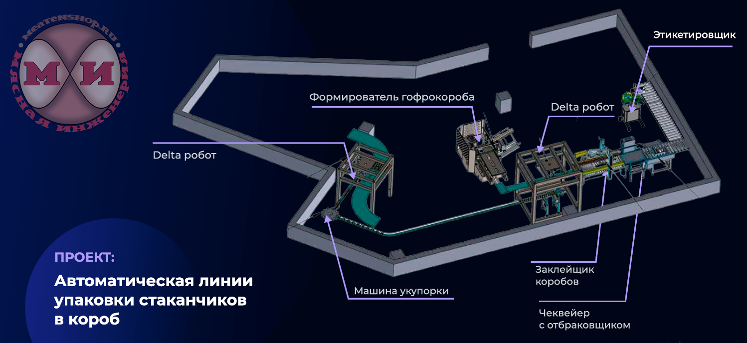 Состав автоматической линии упаковки стаканчиков в короб: - Конвейер приёма продукции — 1 шт; - Конвейер продукта — 2 шт; - Машина укупорки стаканов — 1 шт; - Формирователь гофрокороба — 1 шт; - Этикетировщик — — 1 шт; - Delta робот — 2 шт; - Чеквейер с отбраковщиком — 1 шт; - Конвейер гофрокороба — 2 шт; - Конвейер для готовой продукции — 2 шт; - Заклейщик коробов —1 шт.