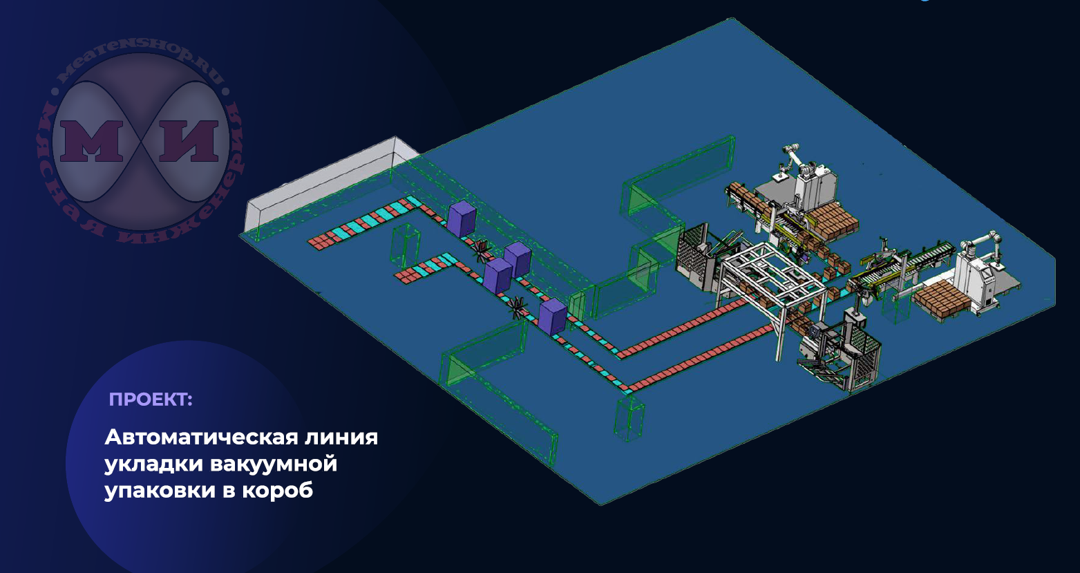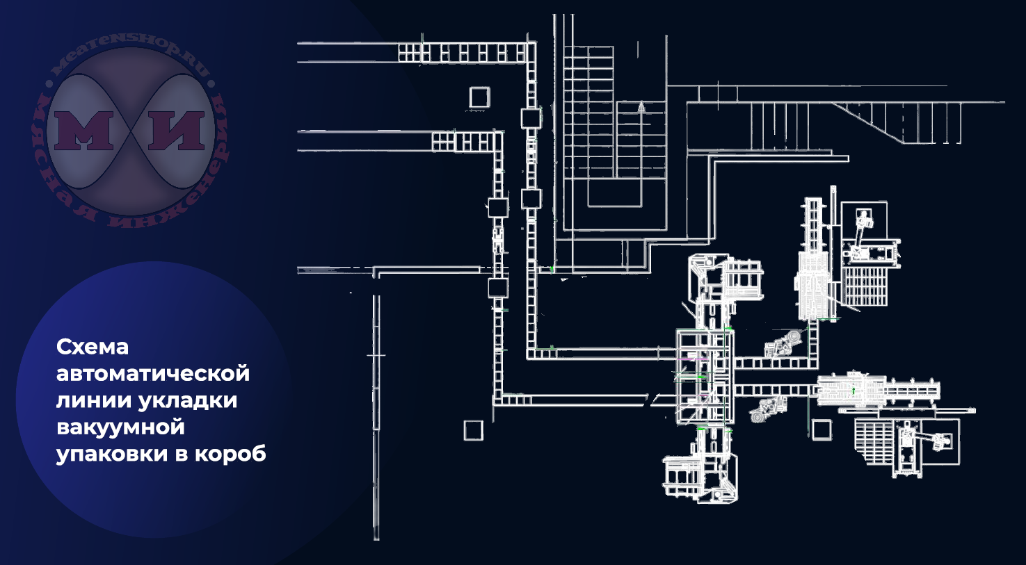 Состав автоматической линии укладки вакуумной упаковки в короб: - Формирователь короба — 2 шт; - Система транспортёров подачи продукта — 2 шт; - Поворотное устройство — 2 шт; - Система транспортёров коробов — 2 шт; - Этикетировщик — 2 шт; - Delta робот — 2 шт; - Система визуального контроля — 4 шт; - Коллаборативный робот — 2 шт; - Устройство подачи пустого короба — 2 шт; - Заклейщик коробов — 2 шт.